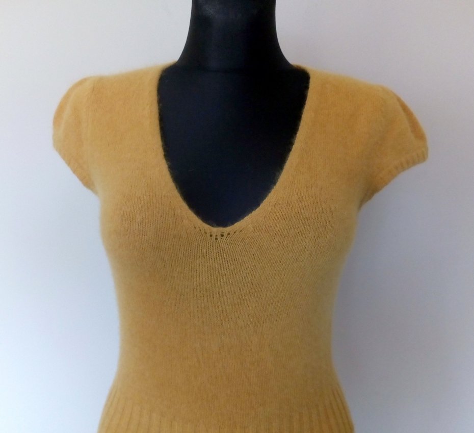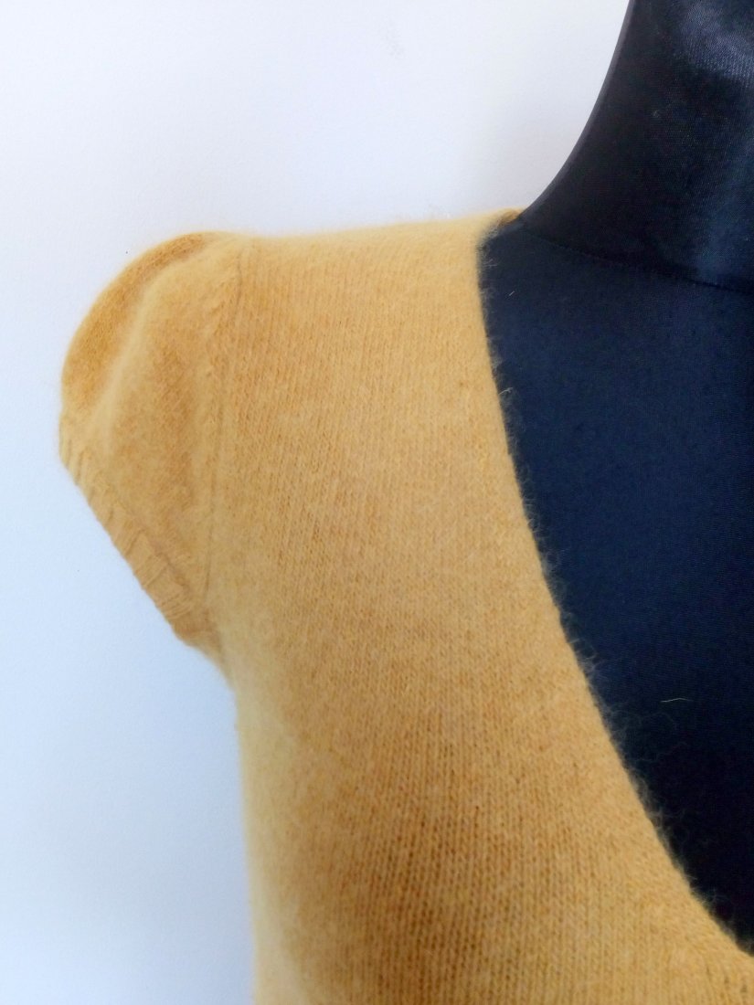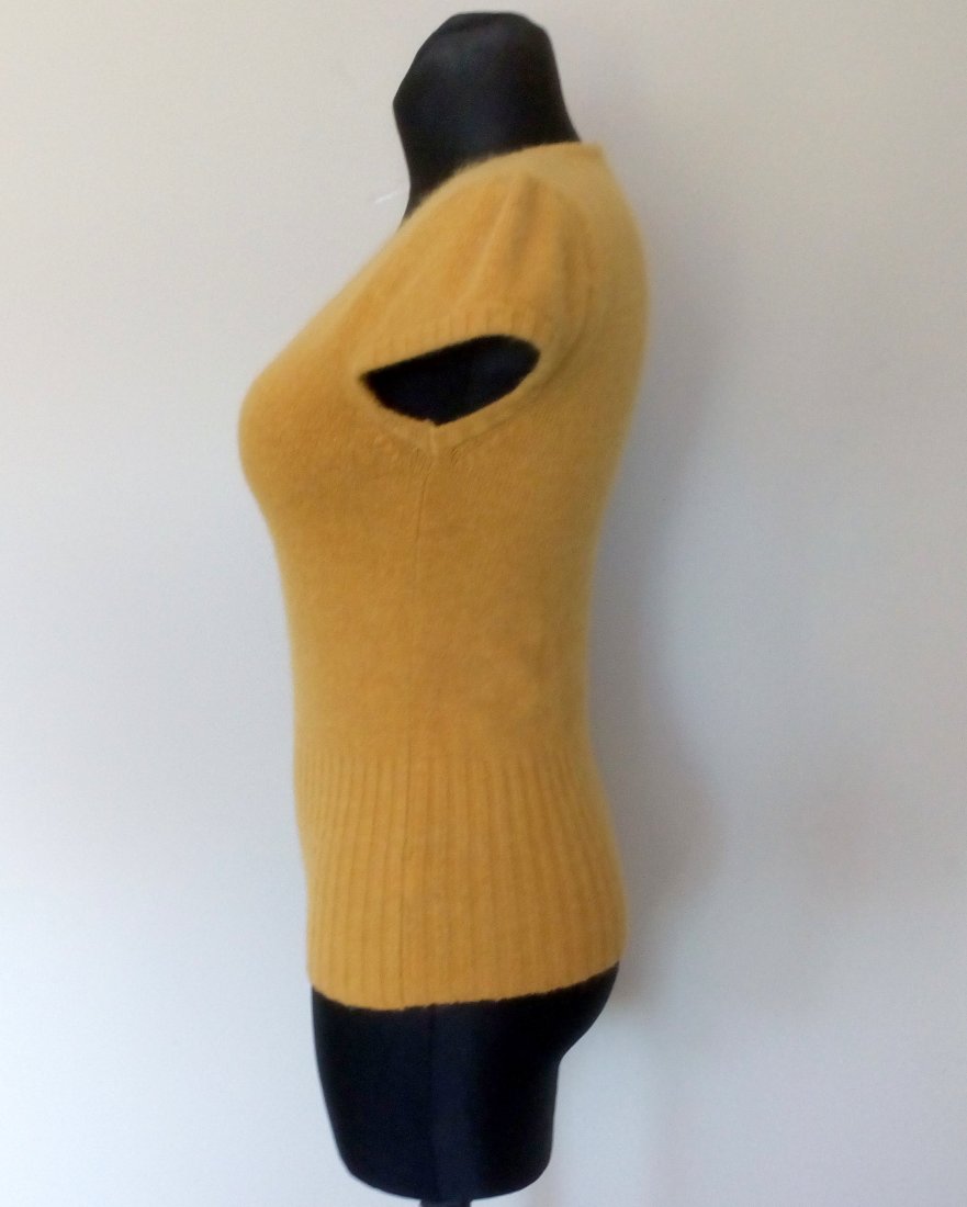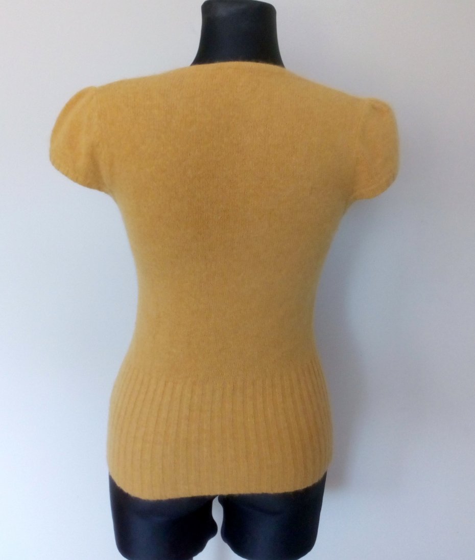 sweterek z udziałem angory, w żółtym- miodowym kolorze, dekolt w szpic, u dołu wysoki ściągacz