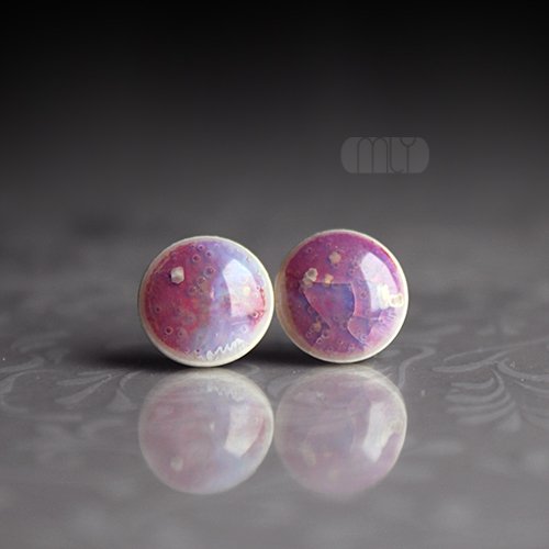 Oryginalne ceramiczne kolczyki w formie sztyftów, ręcznie wykonane z delikatnej gliny kamionkowej, jednostronnie szkliwione błyszczącym różowym szkliwem, na antyalergicznych sztyftach w kolorze srebrnym. Średnica ok 11mm