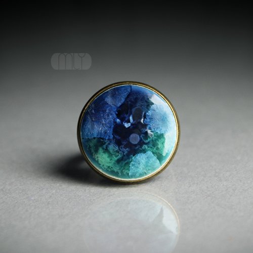 Efektowny pierścień z ceramicznym oczkiem, ręcznie wykonanym z gliny kamionkowej, poszkliwionym mieszanką błękitnych i zielonych szkliw z efektem plamek.Obrączka regulowana w kolorze starego złota, średnica oczka ok 20mm. Polecam