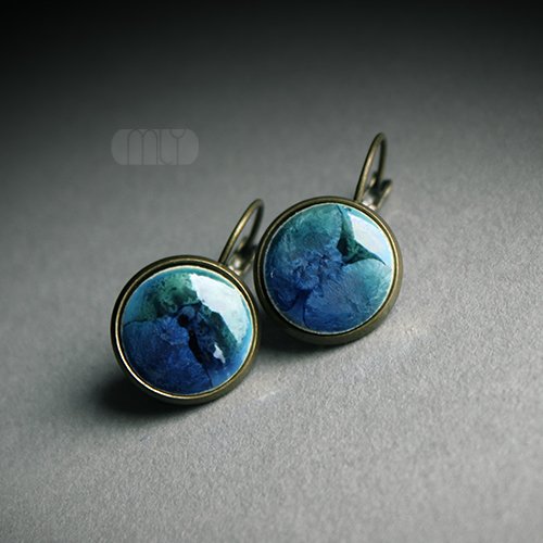 Okrągłe ceramiczne kolczyki, ręcznie wykonane z delikatnej jasnobeżowej gliny kamionkowej, szkliwione mieszanką zielonych i błękitnych szkliw z efektem plamek, na zamkniętych biglach w kolorze starego złota. Średnica elementu ceramicznego ok. 14mm, długość bigla ok 19mm. Polecam