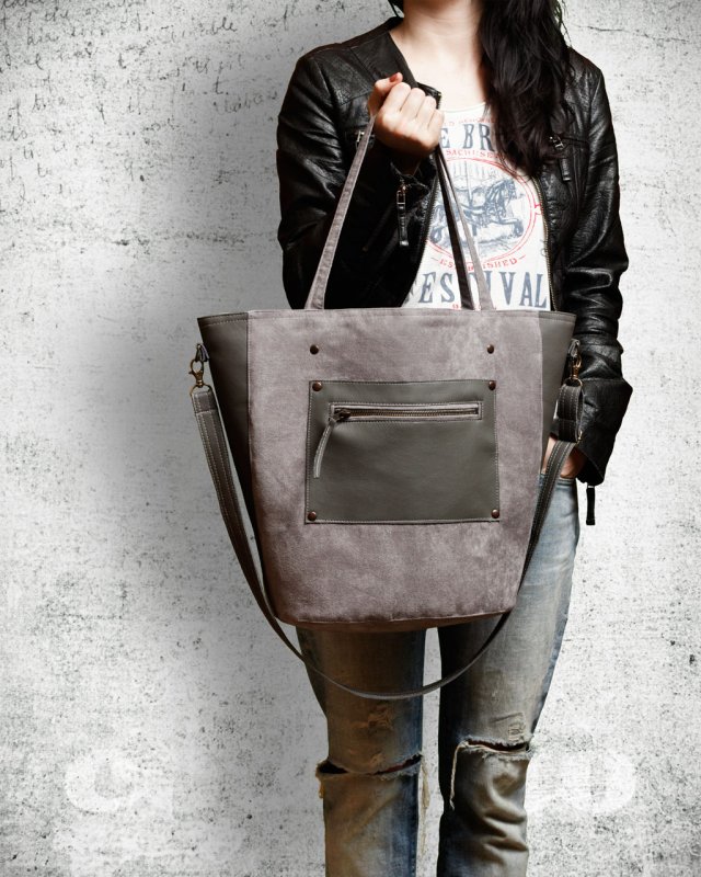 Oryginalna torebka wykonana z zamszu alcantara i eko-skóry w kolorze szarym.