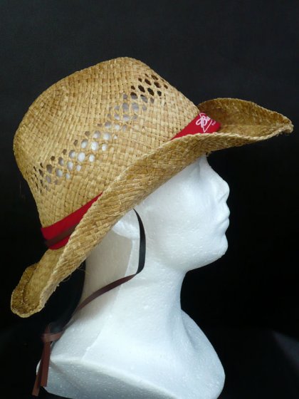 Kapelusz wykonany ze słomki.Obwiązany czerwoną tasiemką z napisem Budweiser-king of beers. Rzemyk z ekoskóry .