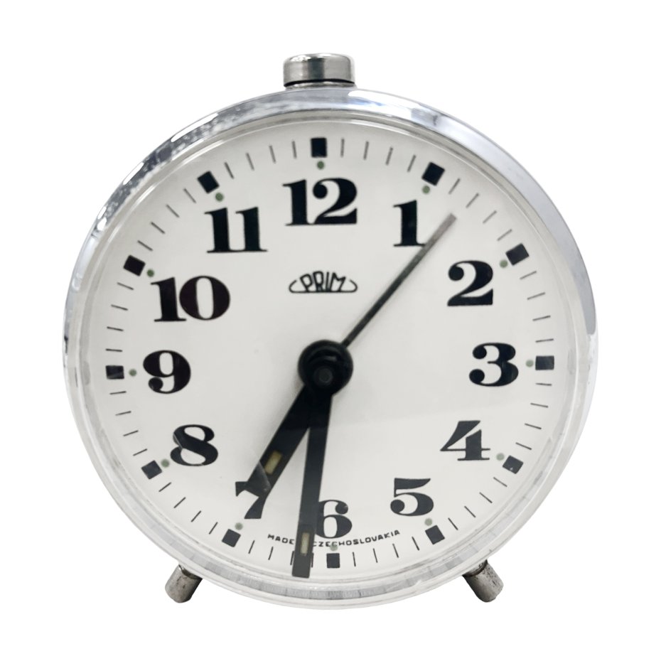 Klasyczny mechaniczny budzik marki PRIM, wyprodukowany w Czechosłowacji. Solidna, chromowana metalowa obudowa w kolorze srebrnym łączy się z kremową tarczą i dużymi, czarnymi cyframi arabskimi. Czytelne, czarne wskazówki oraz subtelne znaczniki minut podkreślają funkcjonalny charakter przedmiotu. Mechanizm nakręcany, typowy dla produkcji z lat 60.–70. XX wieku, ceniony za trwałość i charakterystyczną pracę. Widoczne ślady patyny i drobne oznaki użytkowania dodają autentyczności i kolekcjonerskiego charakteru. Idealny do wnętrz retro, PRL, loft oraz dla miłośników zegarów mechanicznych.