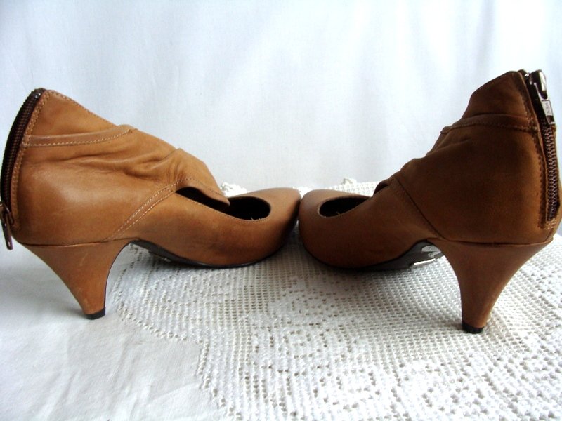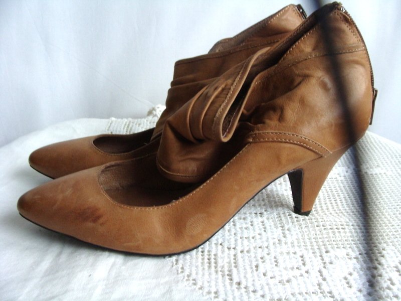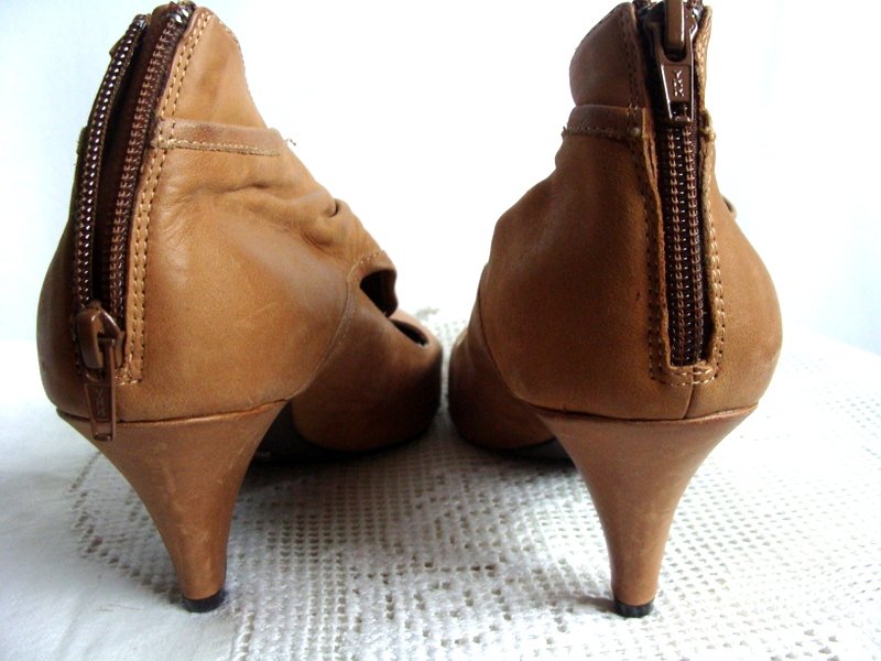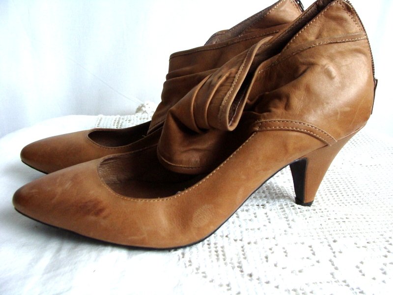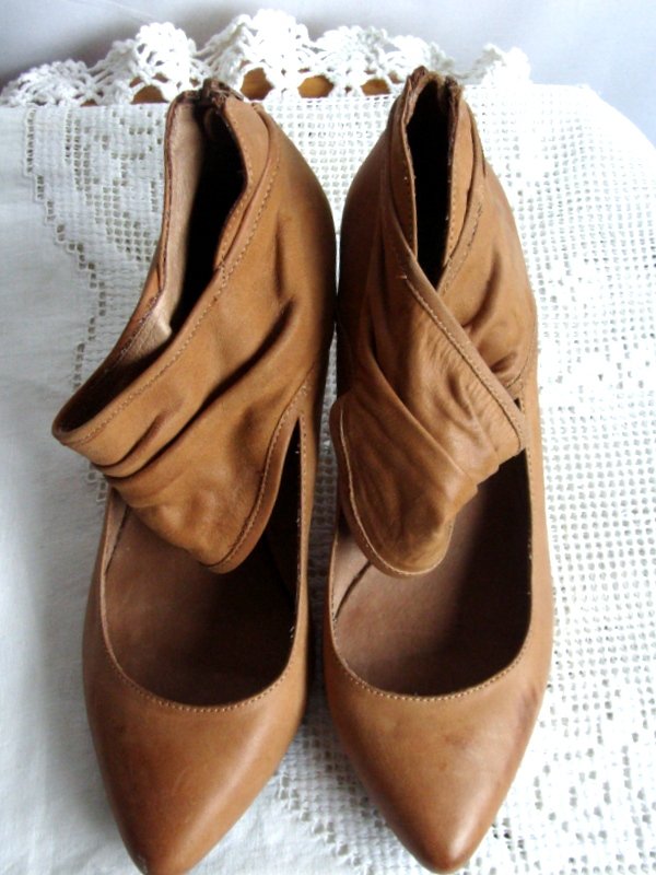 Piękne buciki z naturalnej skóry w koniakowym kolorze z migdałowym noskiem . Zapinane z tyłu na zamek, z drapowaną opaską. Na zgrabnym 6,5 cm obcasie.