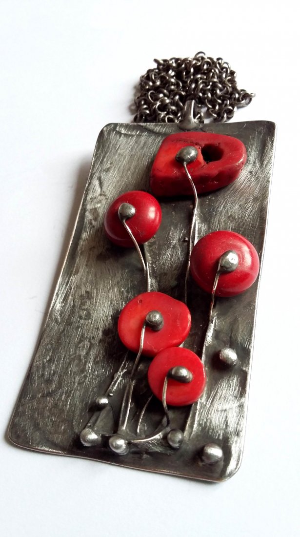 Wisiorek wykonany z miedzi, cyny i koralowców. Wymiary ok. 8,5 na 4,5 cm. Łańcuszek o długości ok. 45 cm.
