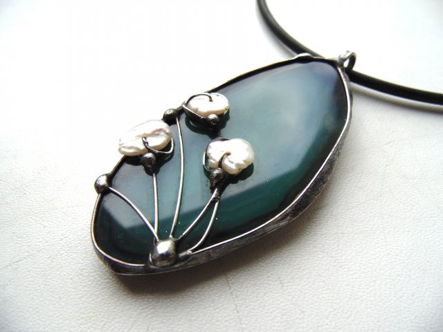 Wisiorek wykonany techniką witrażową z agatu i pereł keishi. Zawieszony na czarnej lince kauczukowej o długości ok. 45 cm. Wymiary ok. 6,5 na 3 cm.