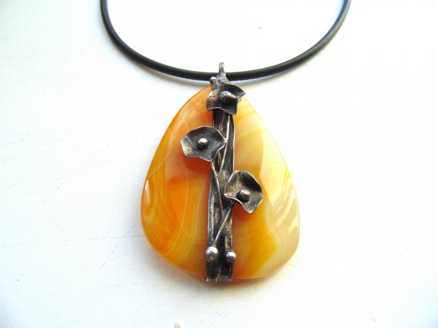 Wisiorek wykonany techniką witrażową z miedzi, cyny i agatu. Zawieszony na czarnej lince kauczukowej o długości ok. 45 cm. Wymiary ok. 6 na 4 cm.