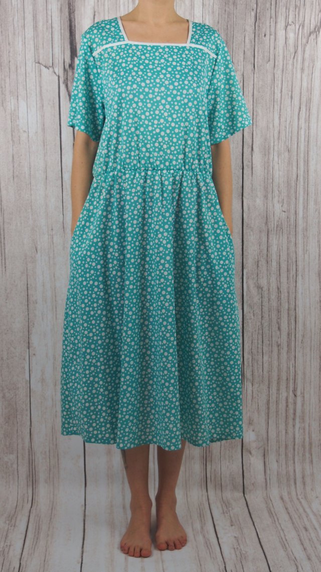 Śliczna miętowa sukienka w groszki z lat 60tych. Produkcji bułgarskiej. 100% poliester. Kieszenie.