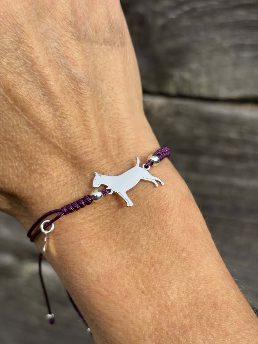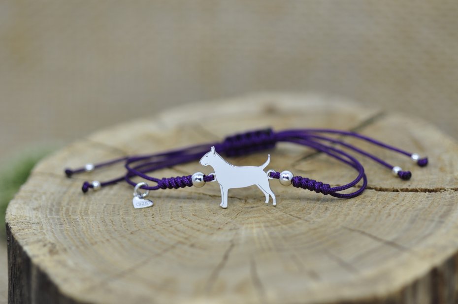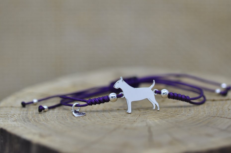 Bullterier wykonany ze srebrnej blachy próby 925, wymiary pieska: 19,1 x 15,9 mm, grubość 0,8 mm oraz srebrne kulki.