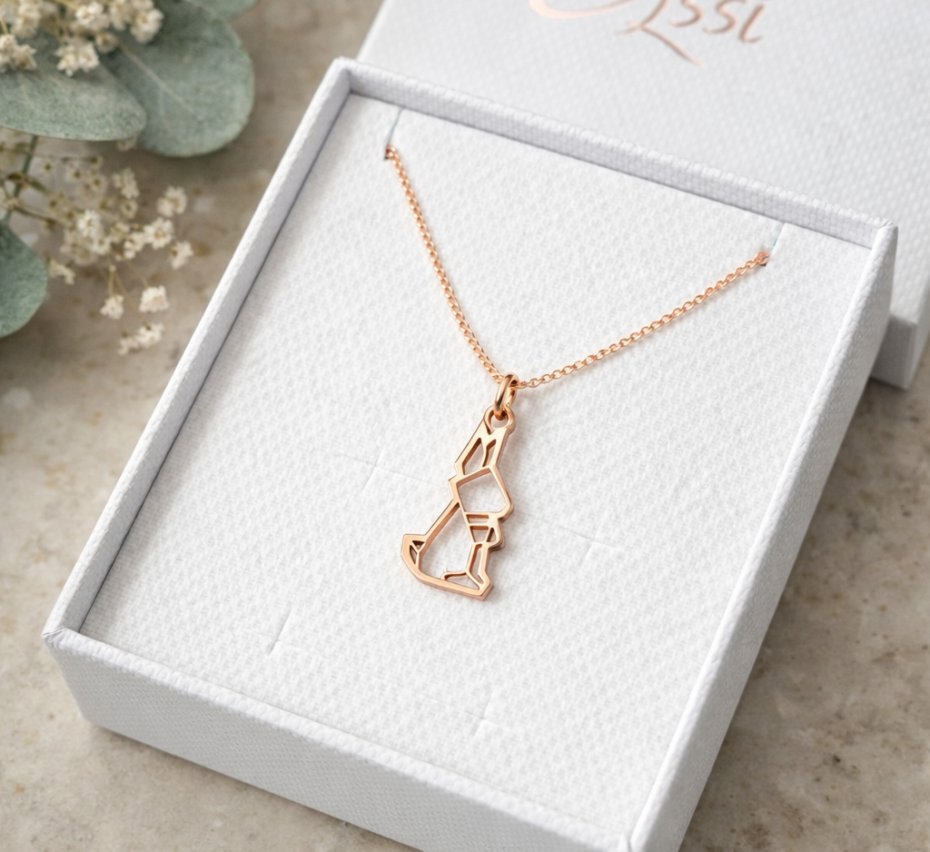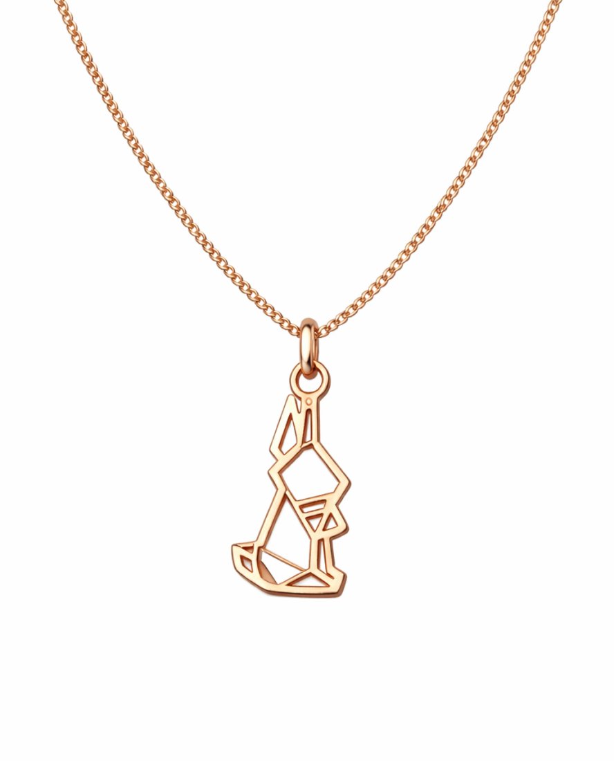 Naszyjnik z geometryczną zawieszką w kształcie króliczka. Wykonany ze srebra pr.925 pokrytego 18 kt różowym złotem. Pokryty dodatkowo warstwą anti-tarnish zabezpieczającą przed ścieraniem i ciemnieniem.