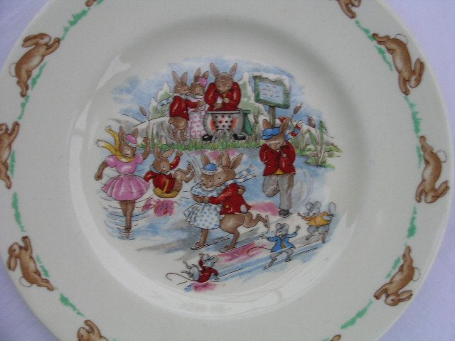 Zimową radością zdobiony talerzyk porcelanowy z kolekcjonerskiej króliczej serii Bunnykins, angielski, sygnowany. Jakość malatury i ecru porcelany; błyszczące szkliwienie. 16 x 1,5 cm. Stan zachowania dobry.