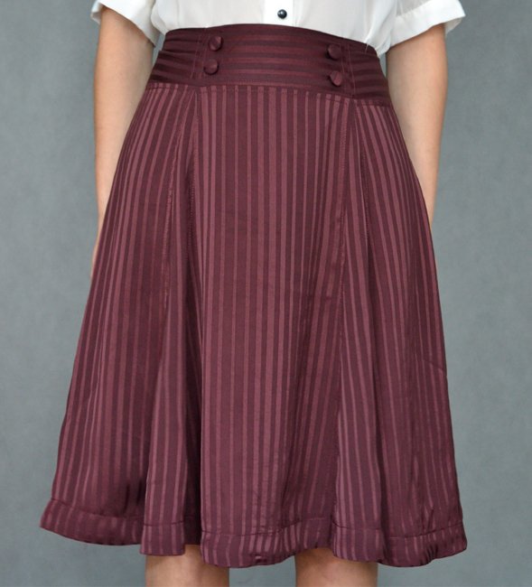 Śliczna spódnica H&M w kolorze burgundu.Rozkloszowana, zwiewna, bardzo kobieca. Wierzchnia warstwa z półprzezroczystego materiału w kryjące prążki. Od spodu podszewka. Na pasie ozdobiona guziczkami. Zapinana na zameczek.
