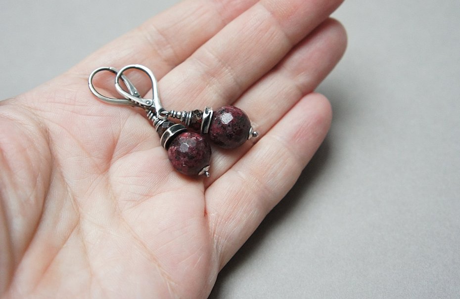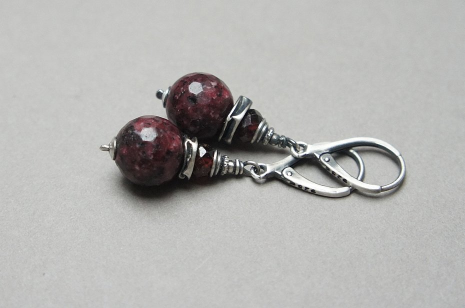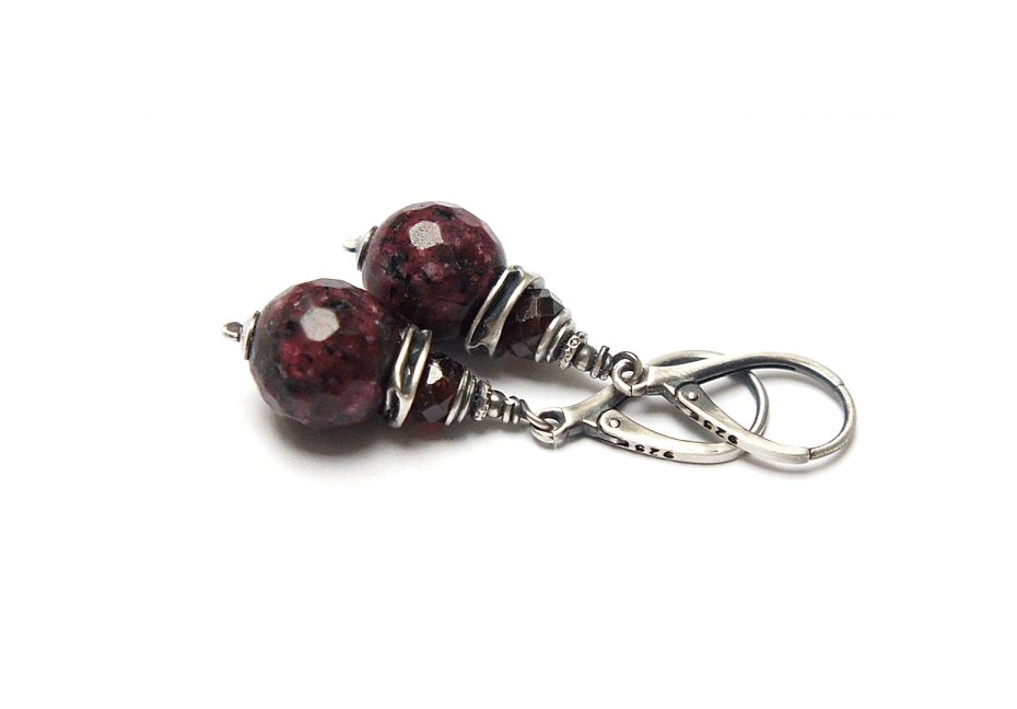 Kolczyki wykonane ze srebra [pr. 925] w połączeniu z fasetowanymi kuleczkami agatów [12mm] oraz fasetowanymi oponkami granatów [6mm]. Srebro oksydowane i przetarte. Całkowita długość kolczyków 4,5cm. Biżuteria ozdobnie zapakowana.
