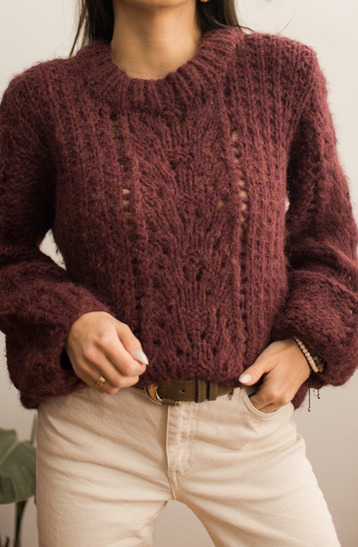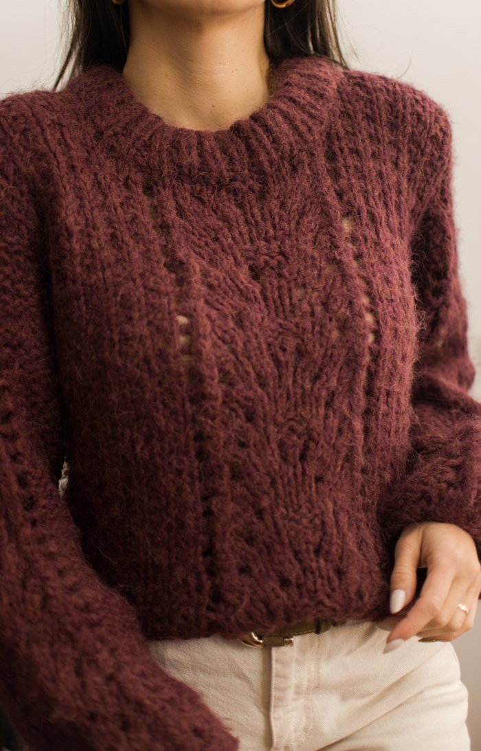 Burgundowy sweter robiony na drutach.
