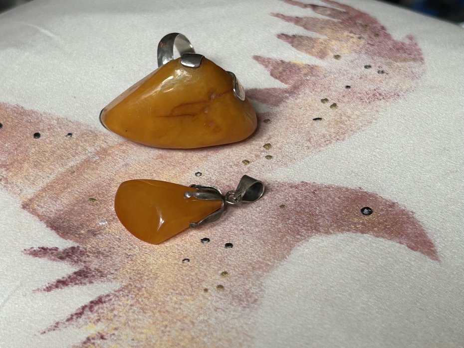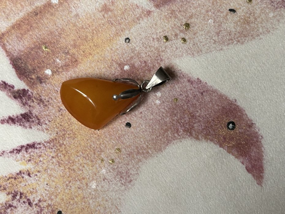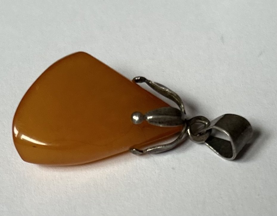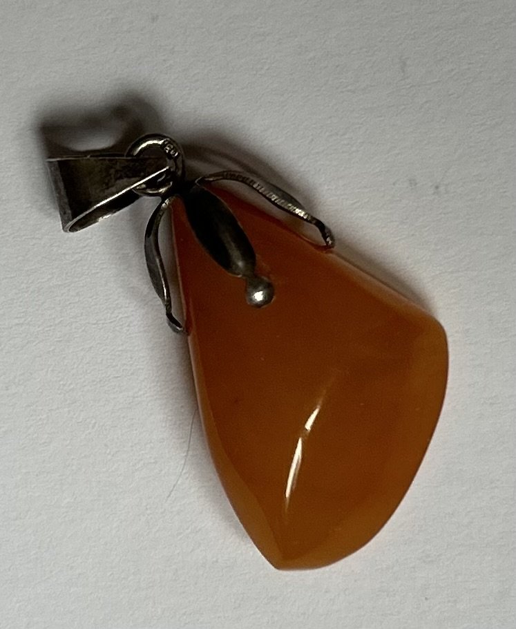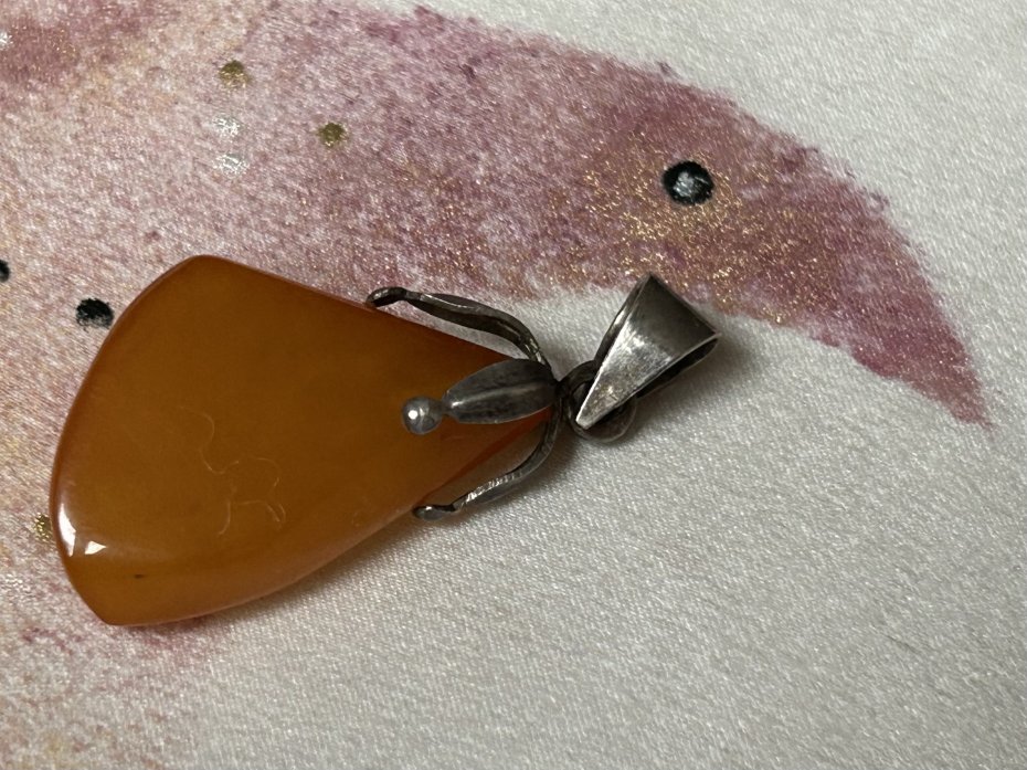 Silver 925 - oryginalna zawieszka ( do lancuszka ) - naturalny bursztyn na srebrnym oksydowanym zaczepie . Asymetryczny bursztyn ,którego uroda pięknie podkreślona została dobrze dobraną i wykonaną srebrną obejmą z zawieszką . ręczna praca .Punca 925. Długość ; bursztyn 3,5 cm plus 1 cm zawieszki szerokość bursztynu 2 cm , Stan zachowania bardzo dobry - wyrób prawdopodobnie z lat 70-ych.