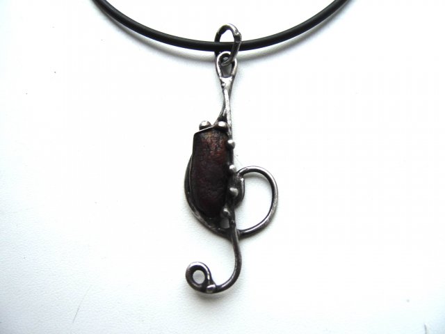 Lekki wisiorek wykonany z miedzi, cyny i surowego bursztynu. Zawieszony na czarnej lince kauczukowej o długości ok. 45 cm. Wymiary maksymalne ok. 7 na 2,5 cm.