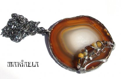Serdecznie zapraszam do spojrzenia na wyjątkowy wisior wykonany z pięknie wybarwionego agatu. Długość plastra agatu, razem z oczkiem 9 cm. Zdobiony szklanymi koraliczkami i kamieniami bursztynowego nefrytu. Używam wyłącznie ekologicznej, bezołowiowej cyny z domieszką srebra. Prawdziwy rarytas :-) Pojedynczy projekt! Zapraszam! MARIAELA