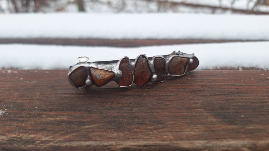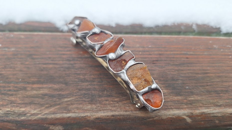Klamra do włosów, wykonana z miedzi, cyny i bursztynów. Wymiary ok. 8 na 2 cm. Zapięcie 6 cm, metalowe.