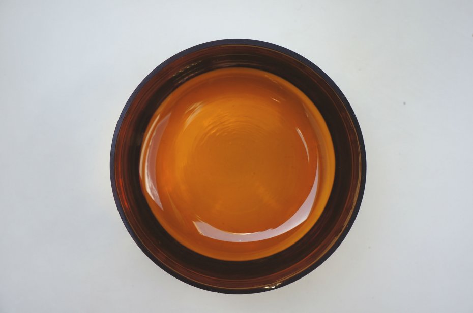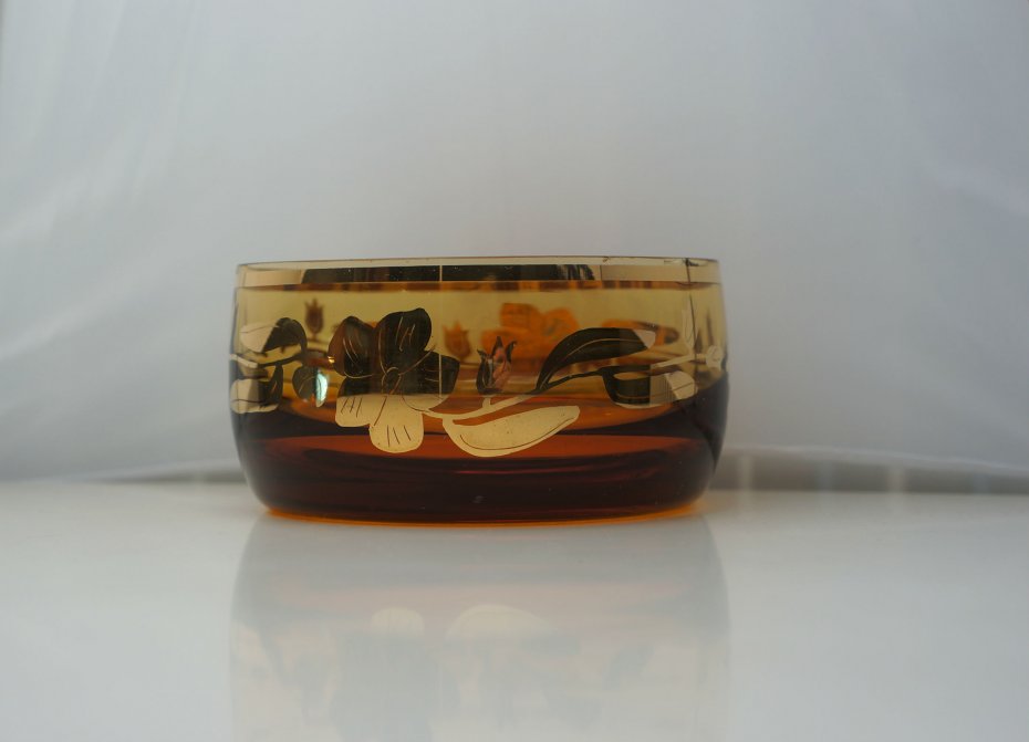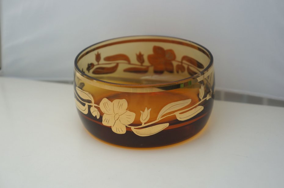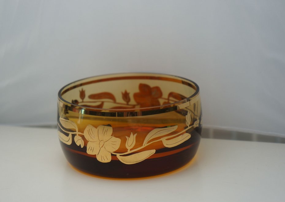 Piękna miseczka z kolorowego, grubego szkła, w kolorze bursztynu ze złotym ornamentem. Pięknie mieni się w słońcu. Przedmiot oryginalny, pochodzi z lat 80. XX w. Stan zachowania dobry, malutkie wykruszenia szkła na brzegu.