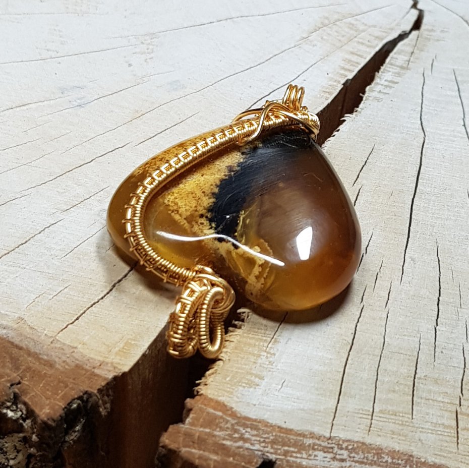 Zawieszka wykonana ręcznie metodą wire-wrappingu której głównym elementem jest serce z bursztynu z Sumatry. Do wykonania wisiorka użyłam miedzianego drutu pokrytego warstwą w kolorze GOLD zabezpieczającą przed ciemnieniem. Wymiary zawieszki 53x37mm , bez łańcuszka.