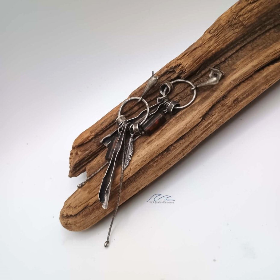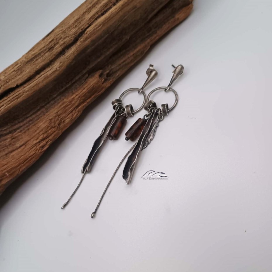 Kolczyki wykonane ręcznie ze srebra pr. 925 i wałeczka bursztynu bałtyckiego w kolorze ciemnego brązu.