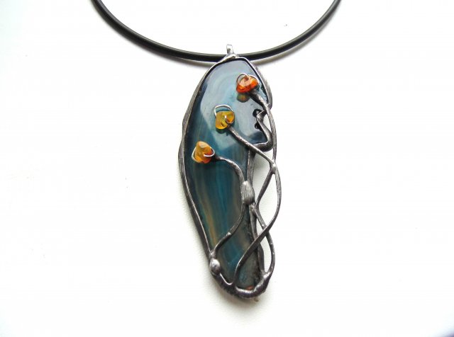 Wisiorek wykonany techniką witrażową z agatu i bursztynów. Zawieszony na czarnej lince kauczukowej o długości ok. 45 cm. Wymiary ok. 8 na 3 cm.