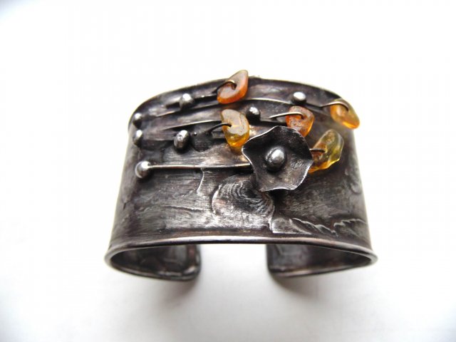 Lekka bransoletka, wykonana z miedzi, cyny i bursztynów. Szerokość ok. 3,5 cm. Obwód regulowany.