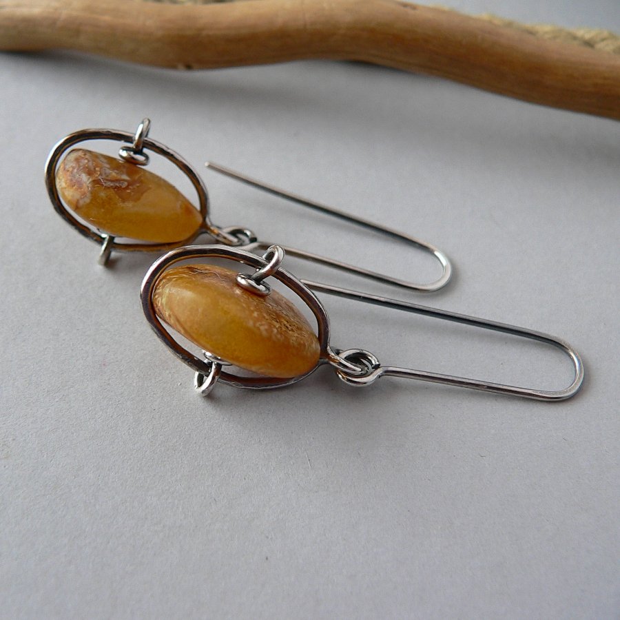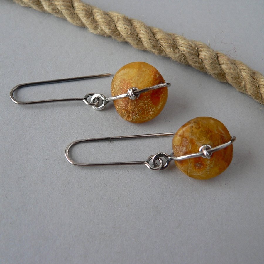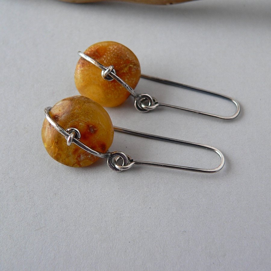 Lekkie, surowe, minimalistyczne kolczyki wykonane ze srebra i oryginalnie mocowanych nieregularnych , matowych pastylek bursztynu. Srebro kute, oksydowane i polerowane. Średnica bursztynów -1,6 cm, długość kolczyka 4,5 cm Bursztyny nie są identyczne. Możliwość zakupu bransoletki z turmalinem do kompletu.
