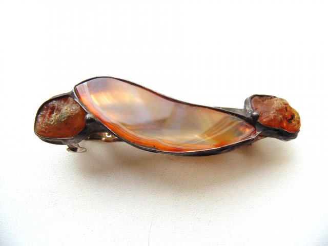 Klamra do włosów, wykonana techniką witrażową z agatu i surowych bursztynów. Zapięcie metalowe, z trzystopniowym zapinaniem zależnie od gęstości włosów. Wymiary ok. 8,5 na 2 cm.