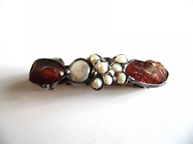 Klamra do włosów, wykonana z miedzi, cyny, bursztynów i pereł słodkowodnych. Zapięcie metalowe, automatyczne. Wymiary ok. 8 na 2 cm.