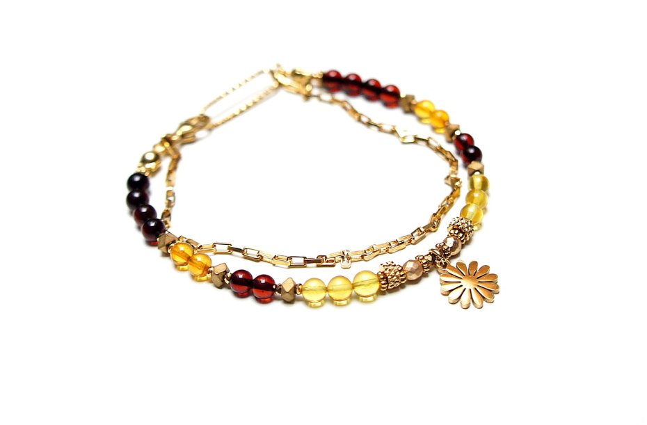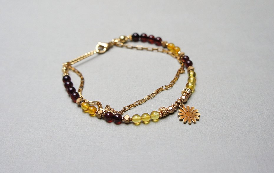 Delikatna bransoletka wykonana w całości ze stali szlachetnej pozłacanej oraz naturalnego bursztynu w trzech kolorach [4mm], hematytu fasetowanego, platerowanego [3mm i 2mm], przekładek z hematytu [1mm oraz 3 x 2mm] oraz zawieszki z cyrkonią w okuciu. Całkowita długość bransoletki ok. 18,8cm. Biżuteria ozdobnie zapakowana.