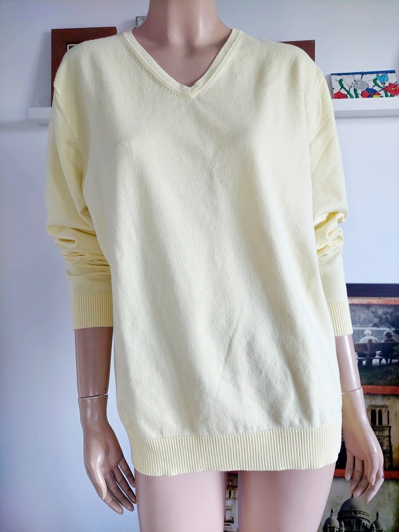 sweter marki Burton London. Materiał 70% bawełna 30% nylon. rozmiar z metki XL. kolor żółty maślany. sweter jest męski (ale panie tez mogą nosić) Na manekinie o rozmiarze małe 38, stan bardzo dobry. Podaję wymiary mierzone na płasko;