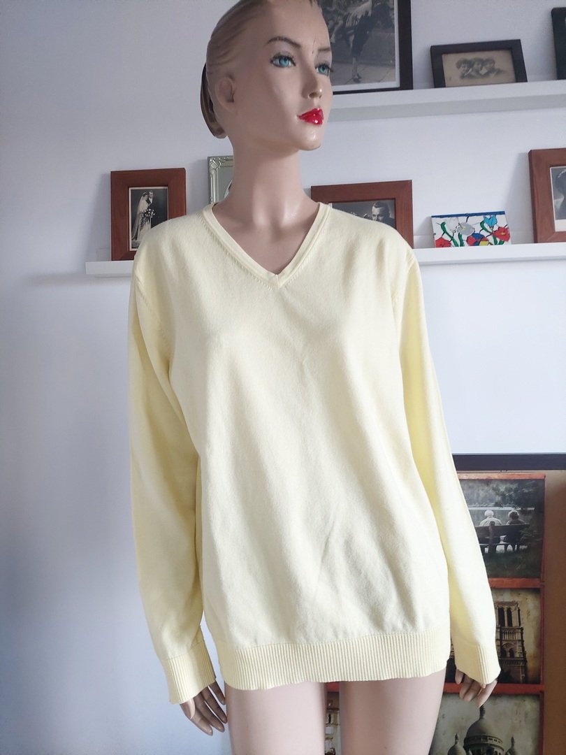 sweter marki Burton London. Materiał 70% bawełna 30% nylon. rozmiar z metki XL. kolor żółty maślany. sweter jest męski (ale panie tez mogą nosić) Na manekinie o rozmiarze małe 38, stan bardzo dobry. Podaję wymiary mierzone na płasko;