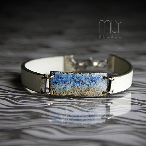 Efektowna bransoletka wykonana ze skórzanego rzemienia jubilerskiego, elementów w kolorze starego srebra i ręcznie wykonanego ceramicznego elementu szkliwionego mieszanką błękitnych i szarych szkliw z efektem plamek. Obwód regulowany. Polecam. Termin realizacji zamówienia to 1-2 dni.