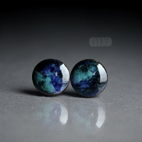 Ceramiczne kolczyki w formie sztyftów, ręcznie wykonane z delikatnej gliny kamionkowej, jednostronnie szkliwione granatowo błękitnym szkliwem z efektem plamek, na antyalergicznych sztyftach w kolorze srebrnym. Średnica ok. 11mm.Polecam