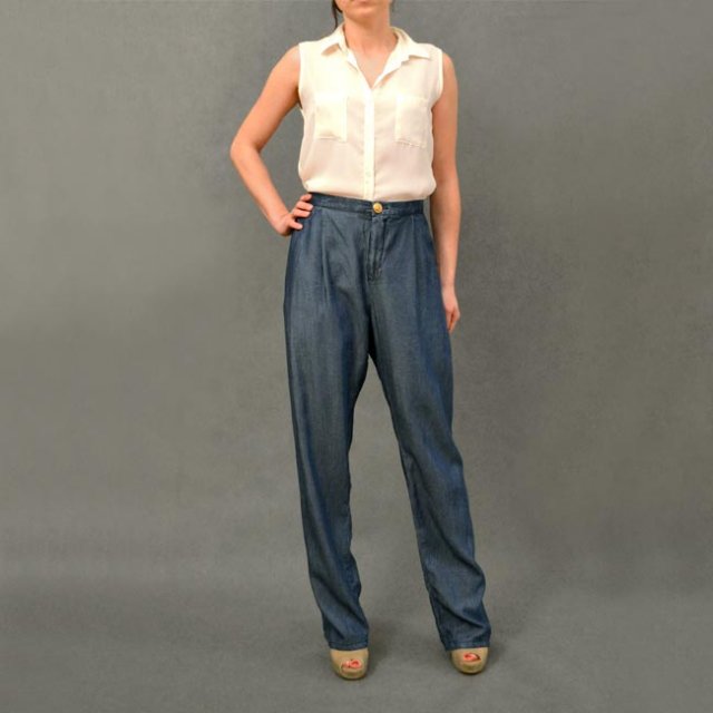 Piękne spodnie wykonane w 100% z tencelu - materiału produkowanego z celulozy drzewnej. Wygląda jak mięciutki lejący dżins z lekkim połyskiem. Luksusowe w dotyku. Bardzo przewiewne, świetne na wiosnę i lato. Krój nogawek lekko zwężany, pod pasem po zaszewce z każdej strony. Zapinane na zamek i złoty guziczek z kotwiczką. Polecam bardzo.