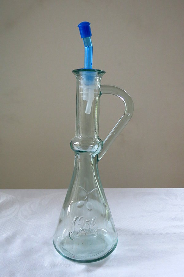 Szklana butelka na oliwę lub olej z dozownikiem.Dozownik wyciągany, zatykany.