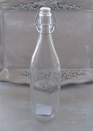 Piękna butelka szklana z retro korkiem. Przedmiot bardzo praktyczny, a jednocześnie wspaniała dekoracja kuchni.