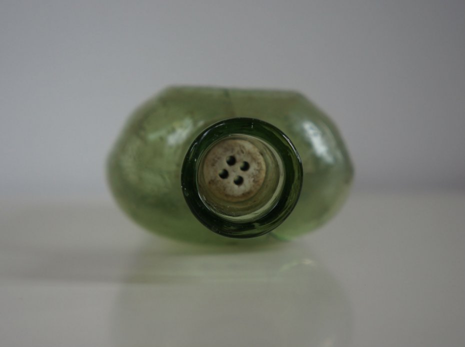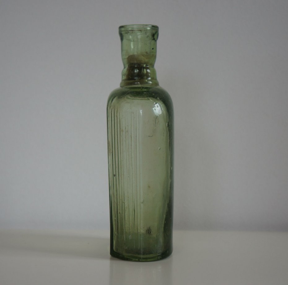 Oryginalna, stara butelka ze szkła. Wewnątrz szyjki znajduje się porcelanowy korek z czterema dziurkami, przez które płyn z butelki można było sączyć kropla za kroplą. Na butelce są napisy w języku niemieckim. Na dnie jest napis PATENT CS.