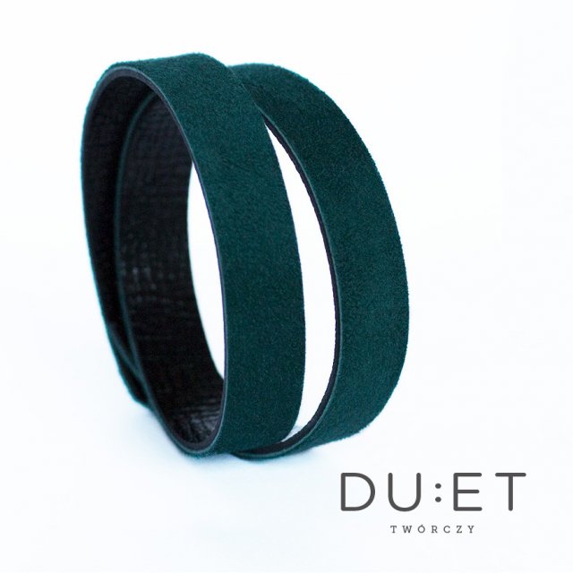 Mięciutka i wygodna bransoletka wykonana z wysokiej jakości skóry naturalnej zamszowej w kolorze butelkowej zieleni. Podklejona skórą naturalną w kolorze czerwonego wina. Subtelna, minimalistyczna ozdoba. Do dwukrotnego owinięcia nadgarstka.