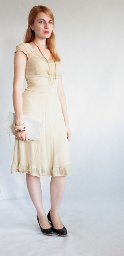 Piękna jasnobeżowa sukienka ekskluzywnej marki BY GROTH o oryginalnej, lekko marszczonej fakturze. Materiał to prawdpoodobnie jedwab (brak składu materiału na metce). Sukienka jest na podszewce, na boku suwak.