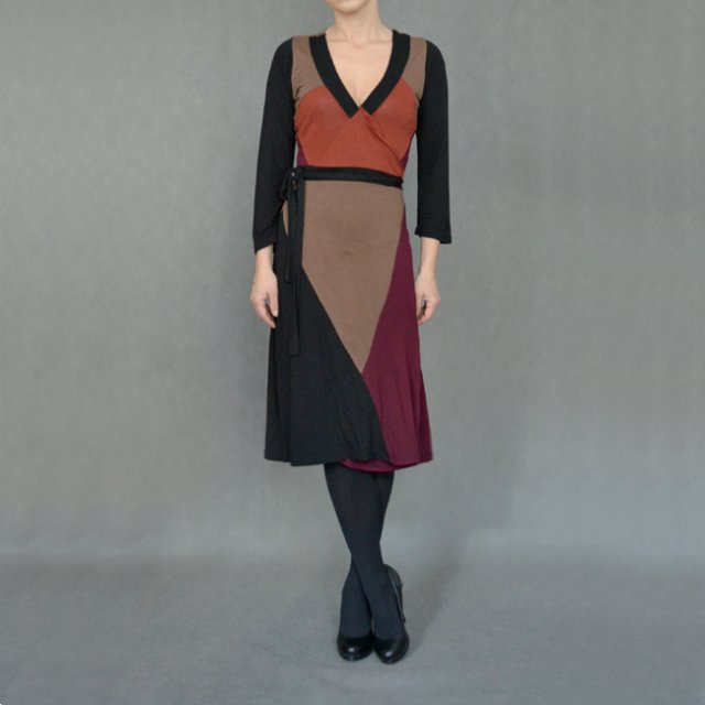 Kopertowa sukienka od KappAhl w jesiennych kolorach, podzielona na geometryczne segmenty. Wiązana w talii.