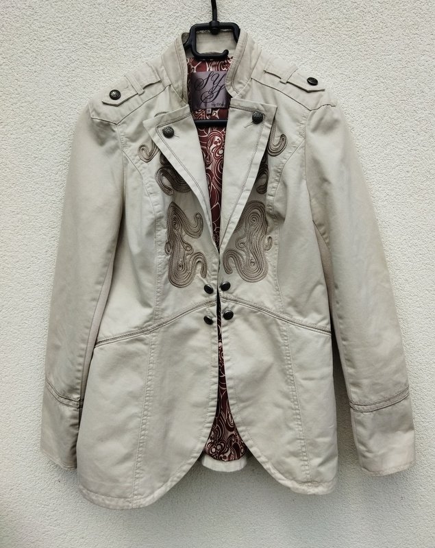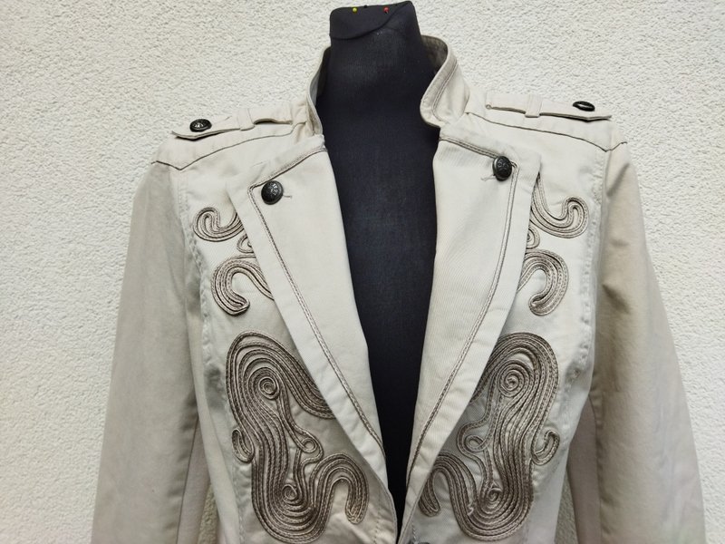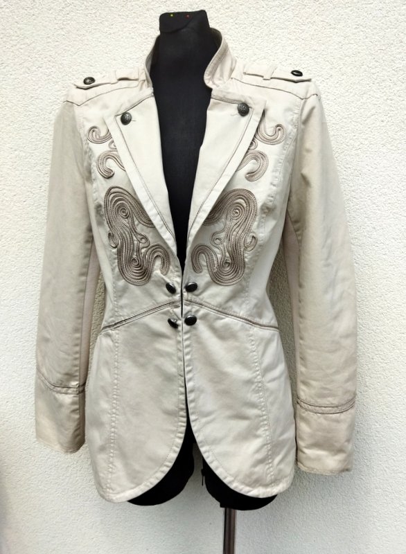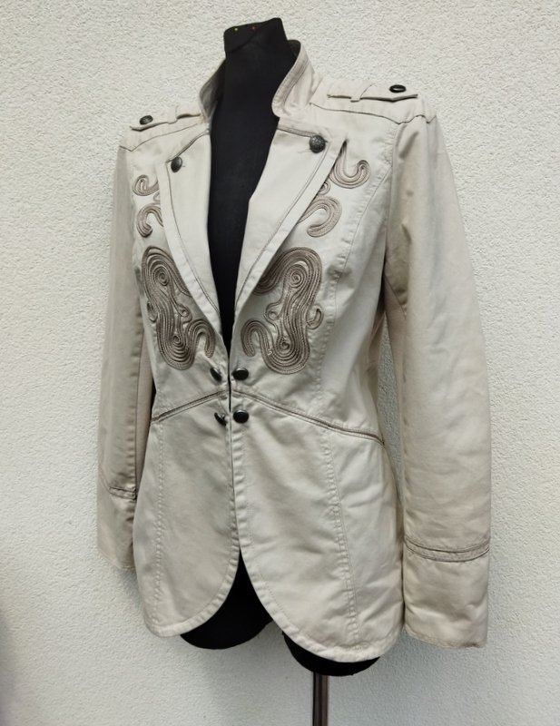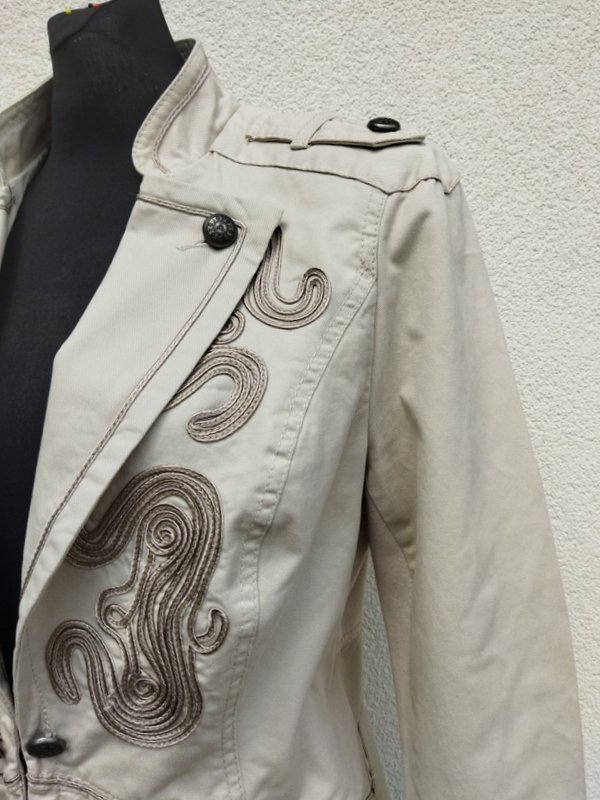 Świetna zgrabna kurtka/ dłuższa marynarka z bawełnianej tkaniny w jasnobeżowym ( piaskowym) kolorze Starannie uszyta z licznymi detalami. Zdobiona sznureczkowym haftem. Zapinana na mocne haftki guziki pełnia role ozdobną. Całość na podszewce