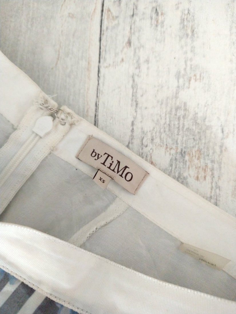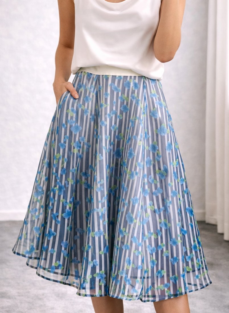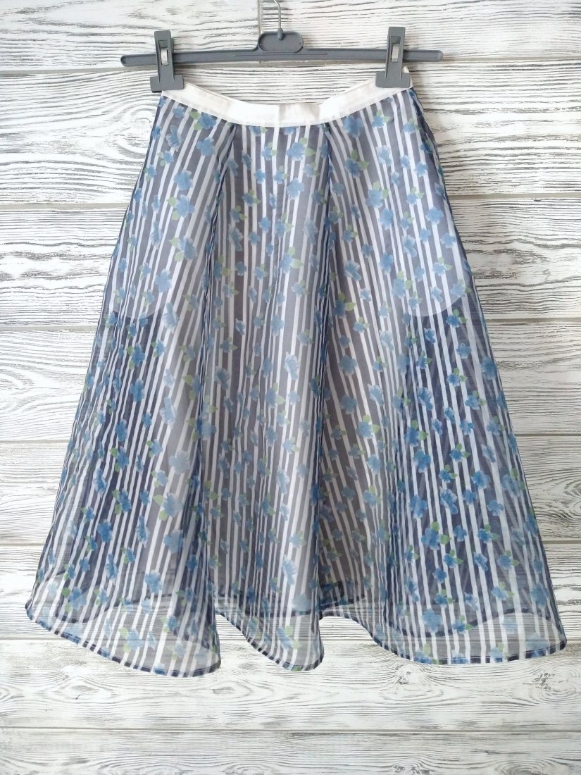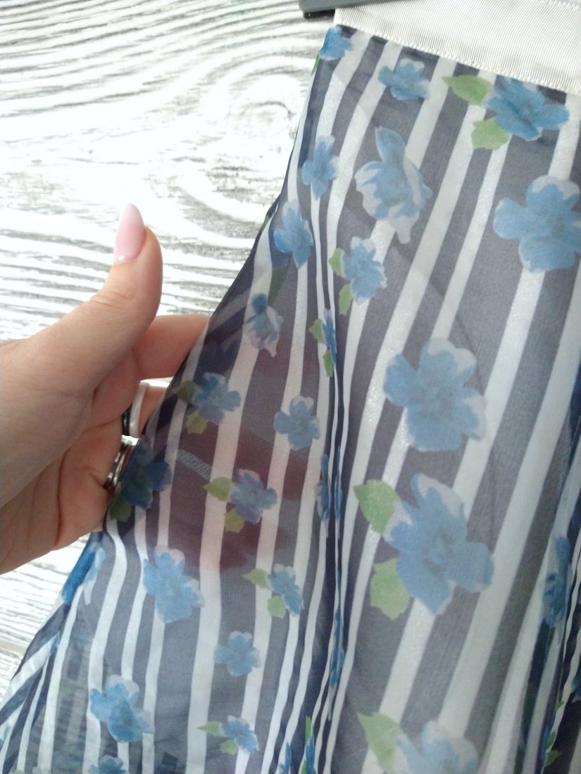 Sztywny, mocno rozkloszowany szyfon (poliester) w paski i błękitne kwiatuszki na wiskozowej podszewce.