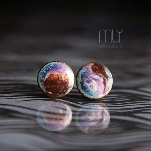 Ceramiczne okrągłe kolczyki, ręcznie wykonane z delikatnej gliny kamionkowej, jednostronnie szkliwione mieszanką wielobarwnych szkliw z efektem plamek, na antyalergicznych sztyftach w kolorze srebrnym. Średnica ok. 11mm. Polecam