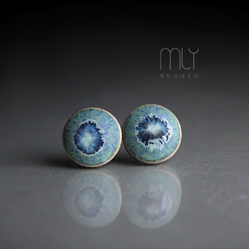 Ceramiczne lekko nieregularne kolczyki w formie sztyftów, ręcznie wykonane z delikatnej gliny kamionkowej, jednostronnie szkliwione mieszanką zielonych szkliw o efektownym perłowym połysku z efektem plamek, na antyalergicznych sztyftach w kolorze srebrnym. Średnica ok. 11mm. Polecam