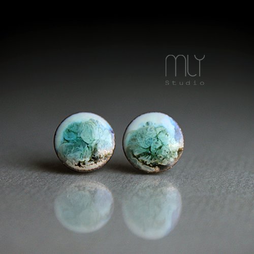Ceramiczne lekko nieregularne kolczyki w formie sztyftów, ręcznie wykonane z delikatnej gliny kamionkowej, jednostronnie szkliwione mieszanką białokremowych, brązowych i zielonych szkliw o efektownym perłowym połysku z efektem plamek, na antyalergicznych sztyftach w kolorze srebrnym. Średnica ok. 9mm. Polecam