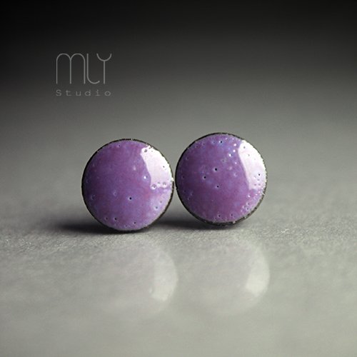 Ceramiczne okrągłe kolczyki, ręcznie wykonane z delikatnej gliny kamionkowej, jednostronnie szkliwione mieszanką fioletowych szkliw z efektem plamek, na antyalergicznych sztyftach w kolorze srebrnym. Średnica ok. 9mm. Polecam