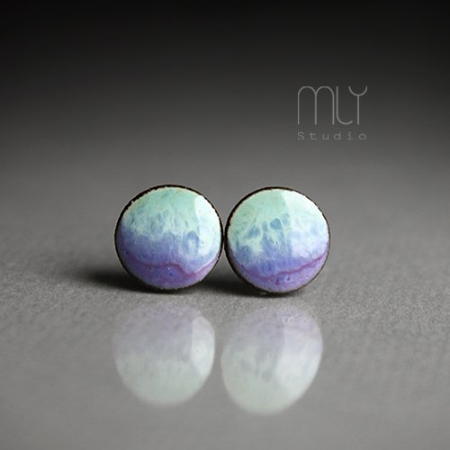 Ceramiczne okrągłe kolczyki, ręcznie wykonane z delikatnej gliny kamionkowej, jednostronnie szkliwione mieszanką fioletowych i miętowo zielonych szkliw z efektem plamek, na sztyftach w kolorze srebrnym. Średnica ok. 9mm. Polecam
