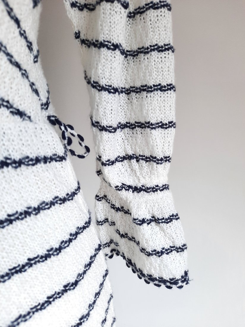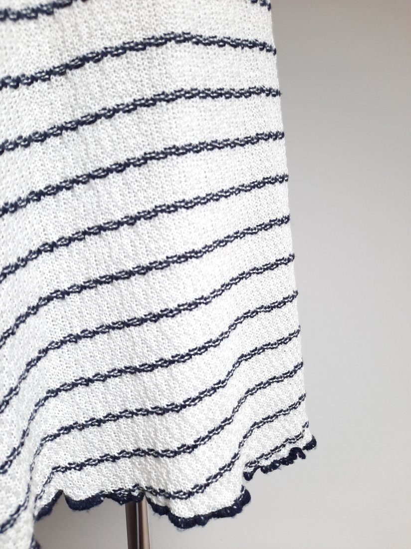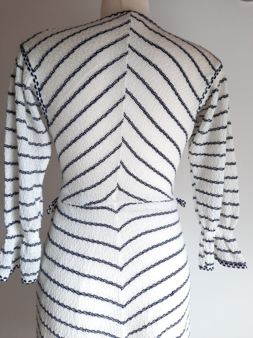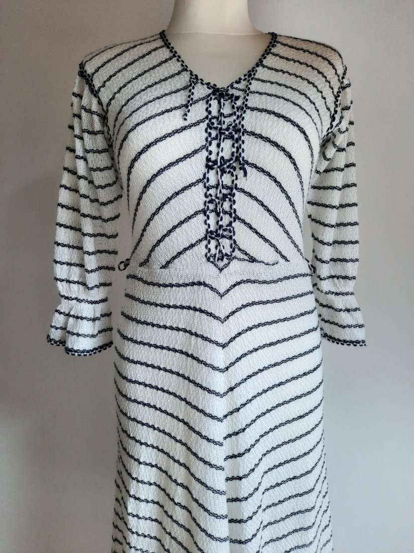 piękna dzianinowa sukienka vintage z dawnej kolekcji C&A z lat według mnie 70-tych, w kolorze białym w drobne poziome paski, dekolt z gorsetowym wiązaniem ściągany troczkami, rękaw o długości 3/4 ściągany gumką i zakończony czymś w rodzaju falbanki, w pasie wszyta gumka, dół na podszewce, rozciągliwy materiał, w pasie szlufki (paska brak), długość poniżej kolan